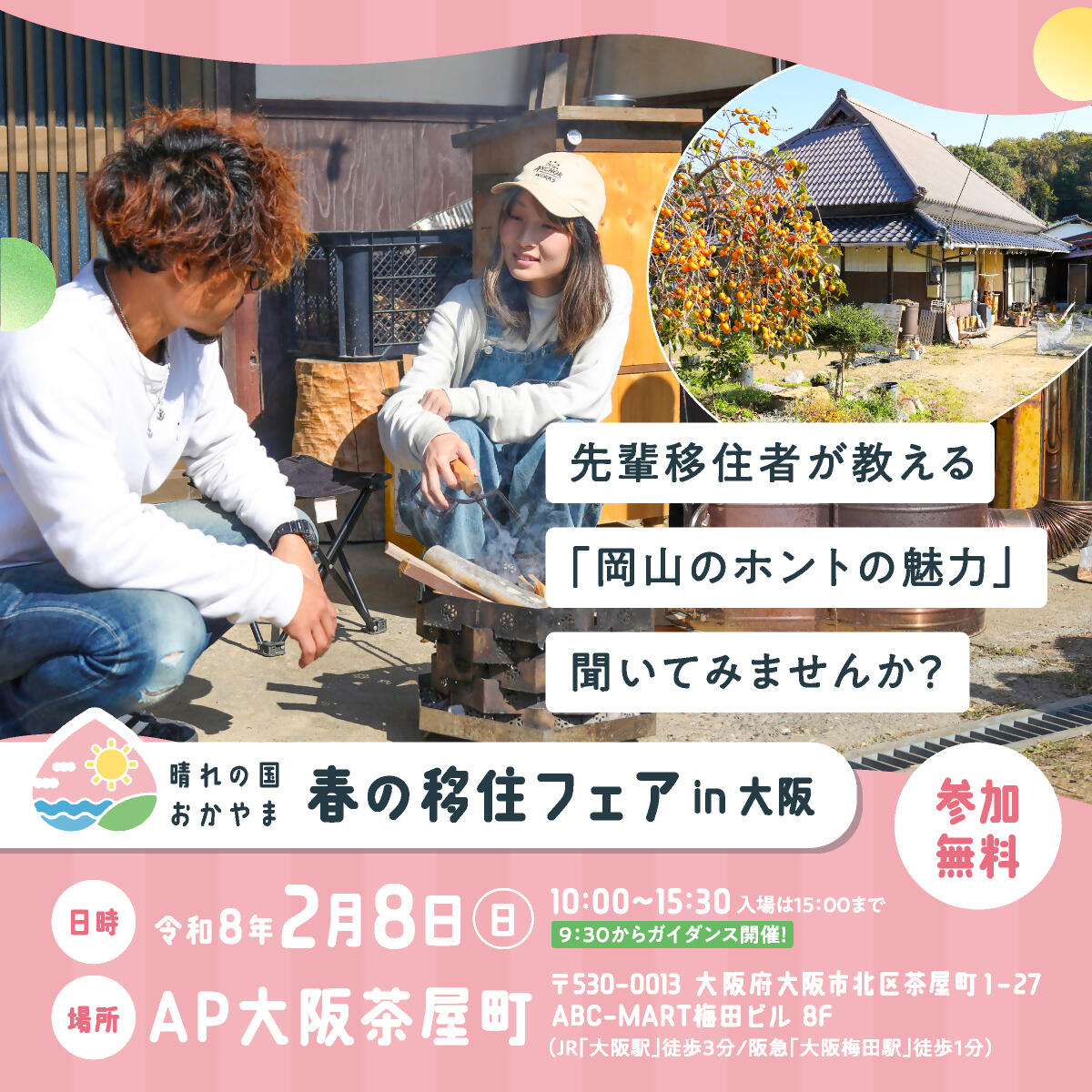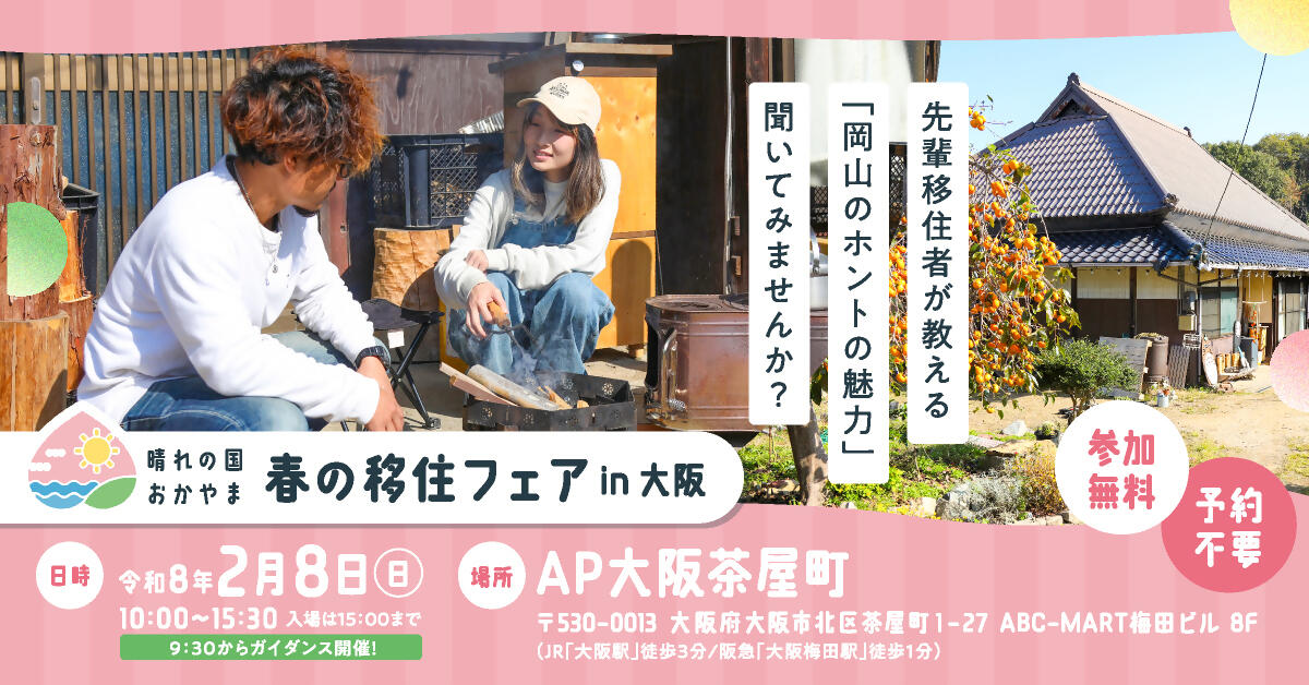 また、西村さんは2月8日(日曜日)に大阪で開催される「晴れに匡おかやま春の移住フェアin大阪」にゲストとしても参加予定。インタビューでは伝えきれなかったお話や、移住後のリアルな暮らしについては、西村さんとお茶をしながら直接聞くことができます。